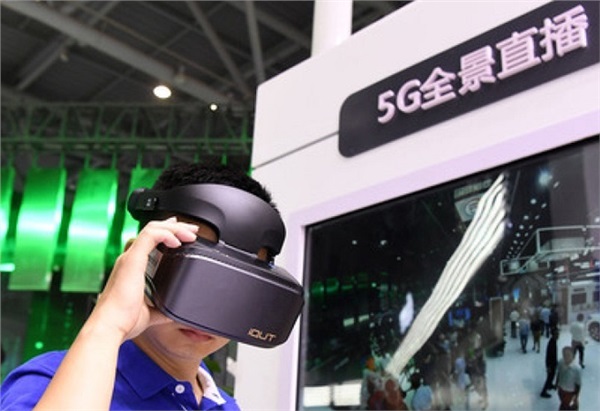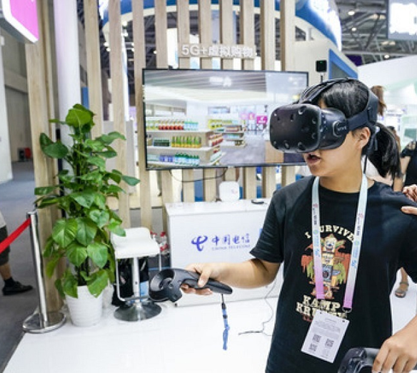 中国电信展厅内,一名小女孩体验5G虚拟在线购物