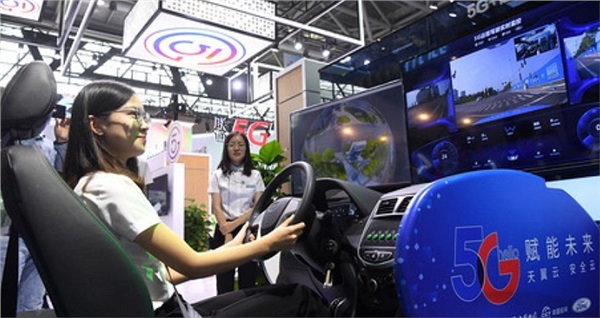 工作人员在智博会上演示“5G+远程驾驶”技术