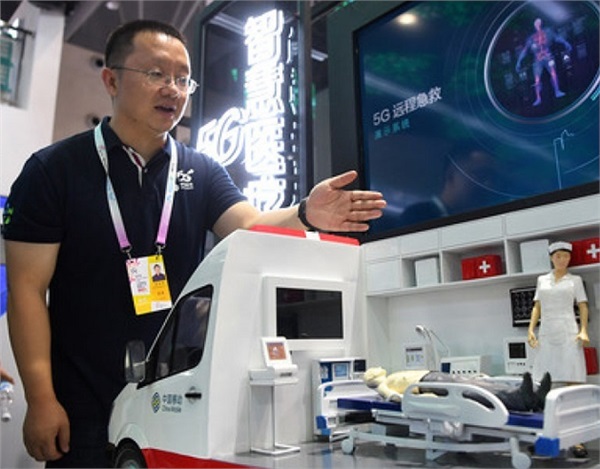 工作人员在智博会上介绍“5G智慧医疗”中的“5G远程急救”技术
